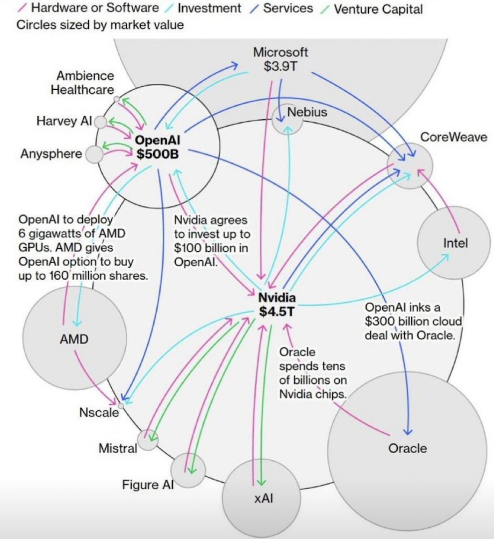 The diagram below is Bloomberg’s now-viral map of the “AI bubble.” It captures the strange reflexivity of today’s market: a handful of companies - OpenAI, Nvidia, Microsoft, Oracle - locked in a self-reinforcing loop of investment, service contracts, and hardware dependence. Nvidia invests in OpenAI; OpenAI buys Nvidia chips; Microsoft sells cloud capacity to OpenAI; Oracle finances and hosts them both. At first glance, it all looks a bit precarious, like a house of cards where each player props up the others.